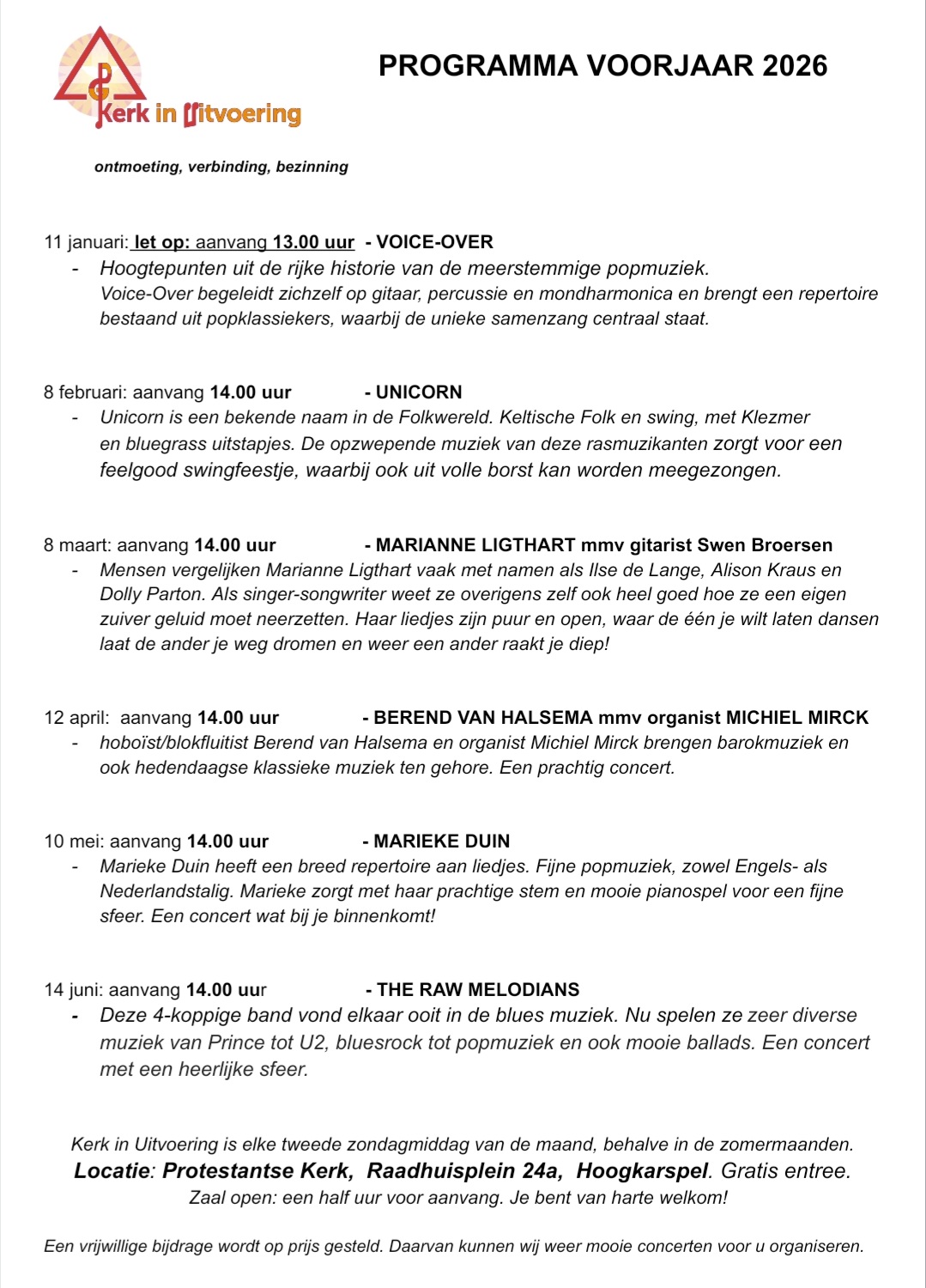 Sinds januari 2024, is er elke 2e zondag van de maand (behalve in de zomermaanden) om 14.00 uur een concert te beluisteren in de sfeervolle zaal van de Protestantse kerk, Raadhuisplein 24a in Hoogkarspel.